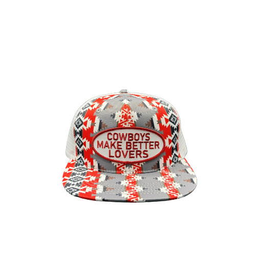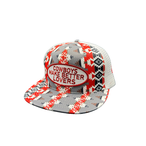Make a bold statement with the Red Aztech print Western Snapback cap featuring the cheeky slogan "Cowboys Make Better Lovers." Crafted for comfort and style, this cap offers an adjustable fit and a striking design that captures the rugged spirit of the West. Perfect for those who want to showcase their confidence and unique personality wherever they go.